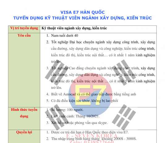 Visa E7 Hàn Quốc tuyển dụng chuyên ngành xây dựng, kiến trúc